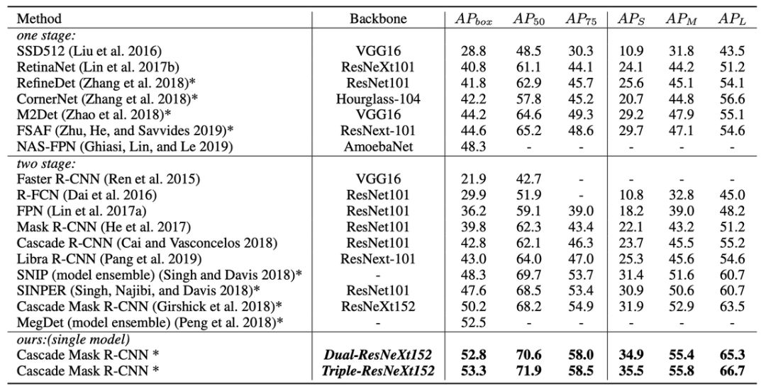 表 3:CBNet 方法和当前最优检测器在 COCO test-dev 数据集上的目标检测性能对比。* 表示使用了多尺度测试。
