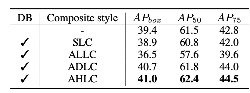 表 4:不同组合形式的对比,基线主干网络为 FPN ResNet101。