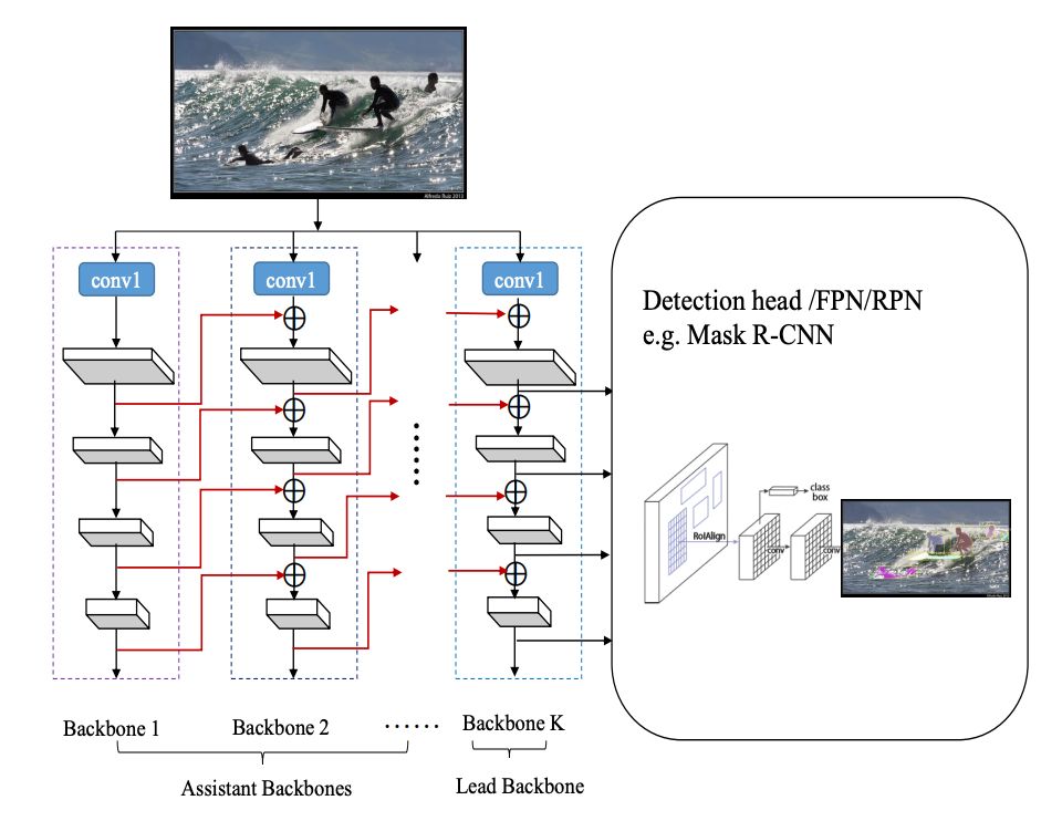 研究者将 K = 2 的情况叫做 Dual-Backbone (DB),将 K=3 的情况叫做 Triple- Backbone (TB)。
