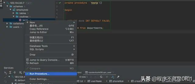从过程的上下文菜单中选择“执行”。将生成SQL代码。输入所需参数的值,然后单击“确定”。如您所见,我们检索此mysql过程的输出,因为我们有SQL代码从JDBC驱动程序获取结果集: