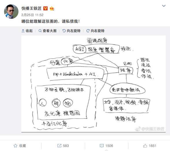 3月25日,换了新头像的快播创始人王欣在微博发布了一张图片,配文“哪位能理解这张图的,请私信我!”图片中有“P2P”、“Blockchain”、“AI”等字眼。很快,网友纷纷留言称:“老王似乎要开搞区块链了”,并同时回应愿向其效劳。
