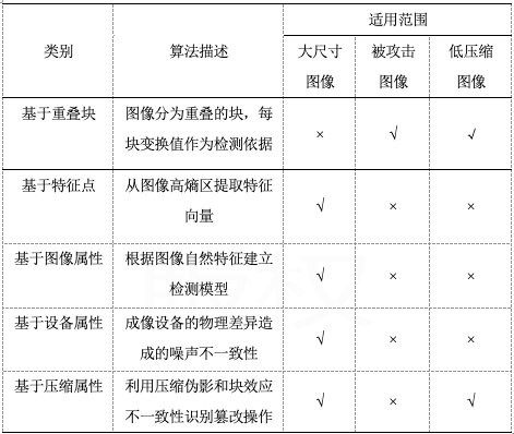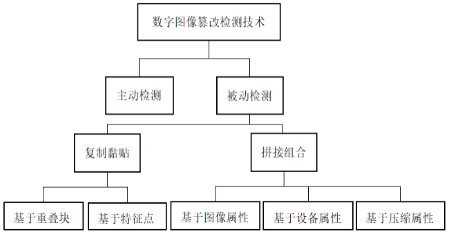 传统的篡改被动检测技术基于图像统计信息和物理特征分别对复制黏贴和拼接组合的两种篡改手段提出相应的检测方法。研究学者根据篡改手段和图像属性的不同,将检测方法分成五个类别,即基于重叠块的检测方法、基于特征点的检测方法、基于图像属性的检测方法、基于设备属性的检测方法和基于压缩属性的检测方法。图像篡改检测类型及技术如图1所示: