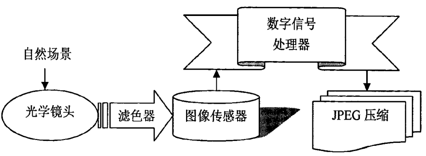 现代多种数字设备(如数码相机、扫描仪、手机等)都可以生成数字图像,不同成像设备来源的数字图像虽然在视觉上并没有太大差异,但是由于各种设备特征的不同(如感光元件、颜色插值等),其产生的数字图像也会有不同的可分辨性特征,通过对这些设备属性特征的提取,使用相应的取证算法进行篡改检测。该方法可以从两个角度来实现,其一是根据彩色滤波阵列(Color Filter Array,CFA),其二是根据相机的传感器噪声(Sensor Noise)。数字图像成像过程如图4所示: