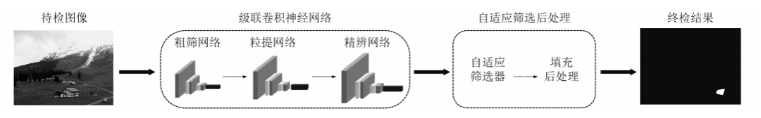 (2)自筛选后处理;前者学习图像中篡改区域和非篡改区域的属性差异,实现多层级篡改区域定位,后者对级联神经网络的检测定位结果进行优化。