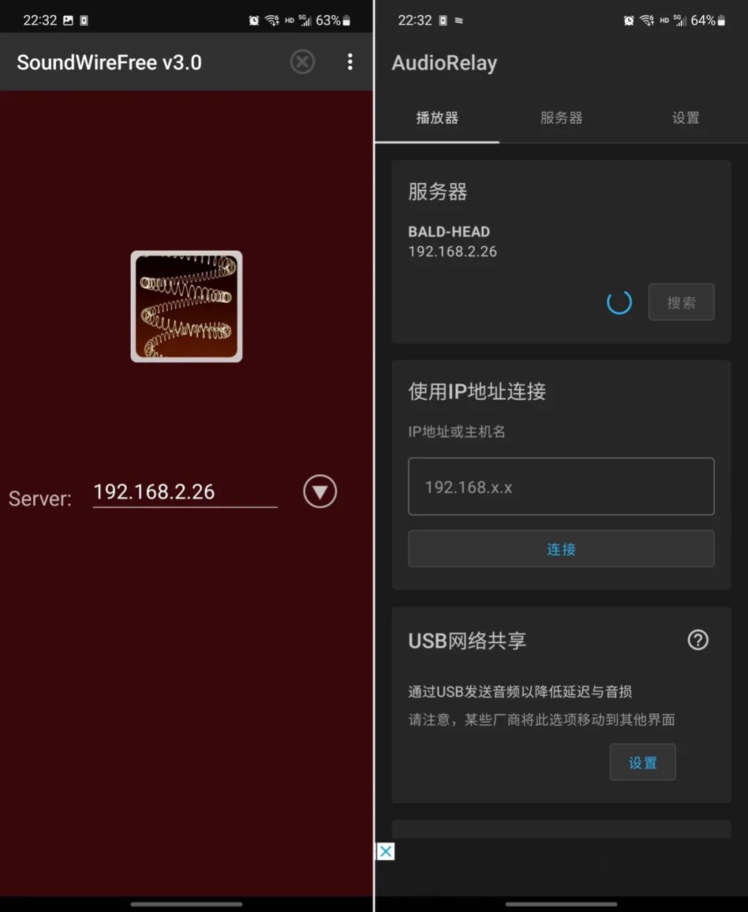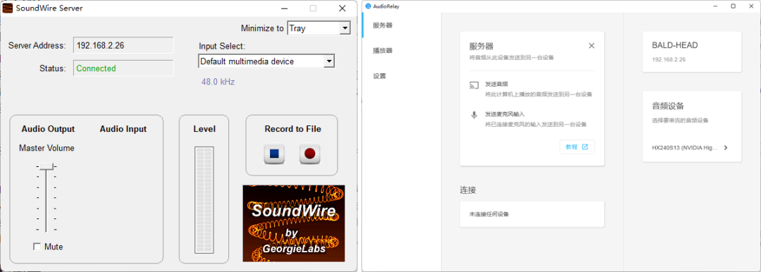 左:SoundWire 服务器端;右:AudioRelay 电脑端