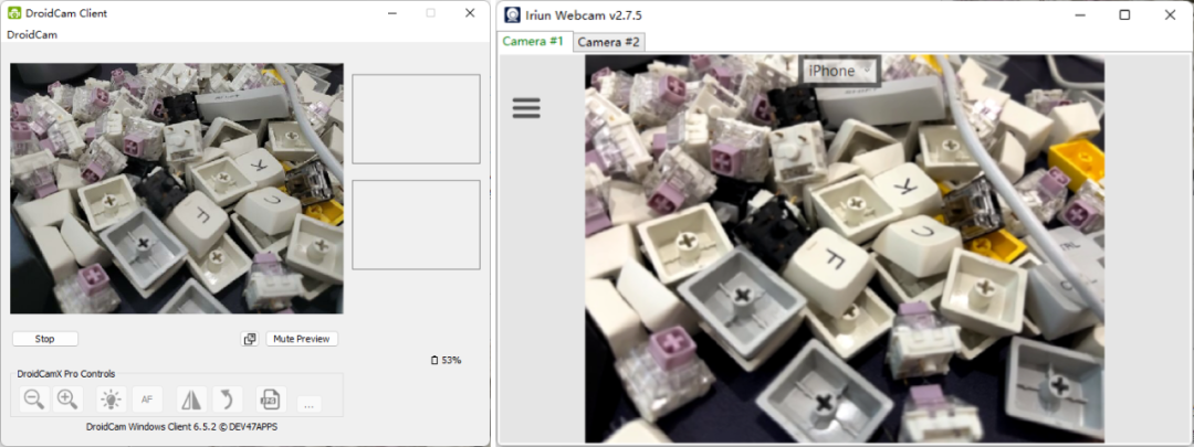 左:DroidCam 电脑端显示;右:Iriun Webcam 电脑端显示