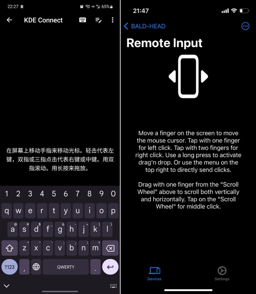 左:Android 端 KDE Connect;右:iOS 端 KDE Connect