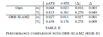 表2.TUM数据集文章方法与ORB-SLAM2效果比较2。