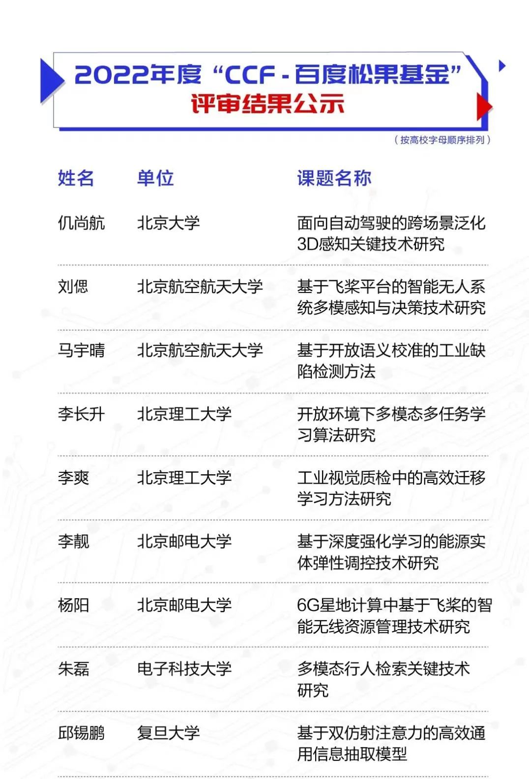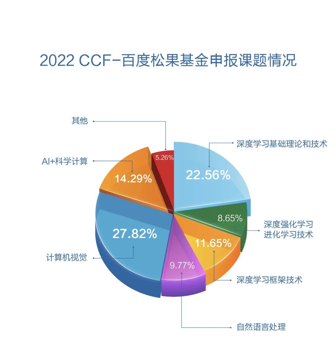 拓展阅读:CCF-百度松果基金于2020年由CCF与百度共同发起,是目前国内唯一基于国产深度学习平台设立的科研基金。它基于我国首个自主研发、开源开放、功能丰富的产业级深度学习平台——百度飞桨,通过为期一年的课题项目,面向40岁以下青年学者,提供数百万课题基金,以及价值上千万的平台、数据、技术等多维度的支持与服务,推动高校与企业在前沿技术探索与实践方面的深度合作,从而推进我国国有深度学习平台在科研领域的应用。