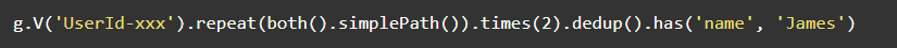 抛开查询语句的复杂度,该类查询语句在关系型数据库中执行起来是非常低效的,往往要秒级才能正常返回。如果进一步变为3度查询,则更慢了。那么,要是采用图数据库呢?以Gremlin为例,你可以很简单的写出这样一段查询语句: