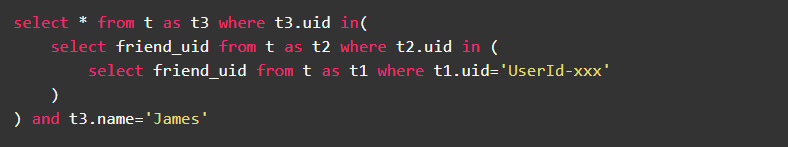 比如,用户UserId-xxx发起“_查询自己2度好友中名字叫James的人_”这样一个查询请求。以传统关系数据库的做法,你可能会写出如下查询语句: