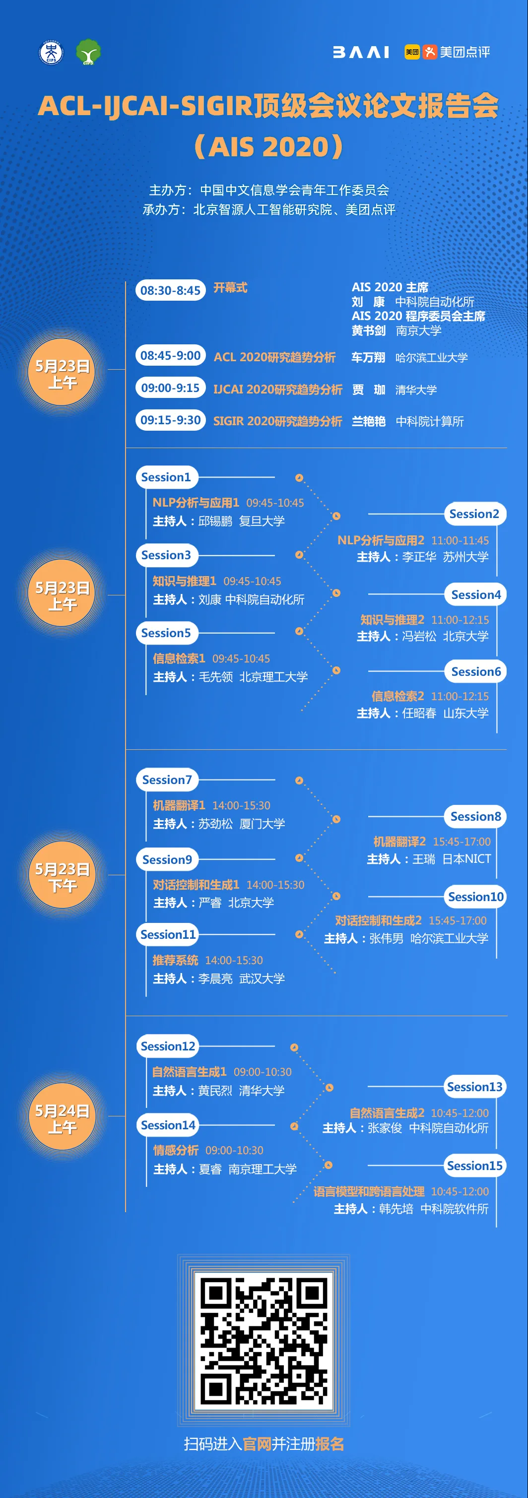AIS 2020 由北京智源人工智能研究院、美团点评承办,共征集三大会议论文共 74 篇,分为 15 个 session,包含自然语言分析和应用、知识和推理、信息检索、推荐系统、机器翻译、情感分析、对话控制和生成、自然语言生成、语言模型和跨语言处理等热点研究问题和方向。