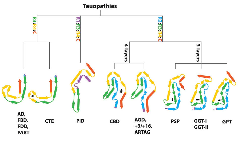 根据tau蛋白细丝折叠来分类tau蛋白病,图片来自MRC Laboratory of Molecular Biology 举个例子吧。上面提到过阿尔兹海默症,其实,家族性英国痴呆(familial British dementia,FBD)和家族性丹麦痴呆(familial Danish dementia,FDD)病例tau丝的结构与阿尔茨海默病(AD)和原发性年龄相关tau蛋白病(primary age-related tauopathy,PART)病例中的结构相同。再比如,进行性核上性麻痹(progressive supranuclear palsy,PSP)出现的频率仅次于阿尔兹海默症,也是一种常见的tau蛋白病。这篇文章发现了进行性核上性麻痹(PSP)的tau丝结构是一个全新的三层折叠结构,而且球状胶质陶氏病(globular glial tauopathy,GGT)的tau丝结构与进行性核上性麻痹(PSP)十分相似,只有尾端有所不同。目前,科学家们正在努力寻找不同的tau蛋白褶皱形成的分子机制,不过结果现在仍是未知数。Sjors H. W. Scheres和Michel Goedert团队也正在继续研究此课题,如果有一天真的能破译tau蛋白褶皱形成的分子机制,tau蛋白病的诊断和治疗将会迎来一个全新的时代。