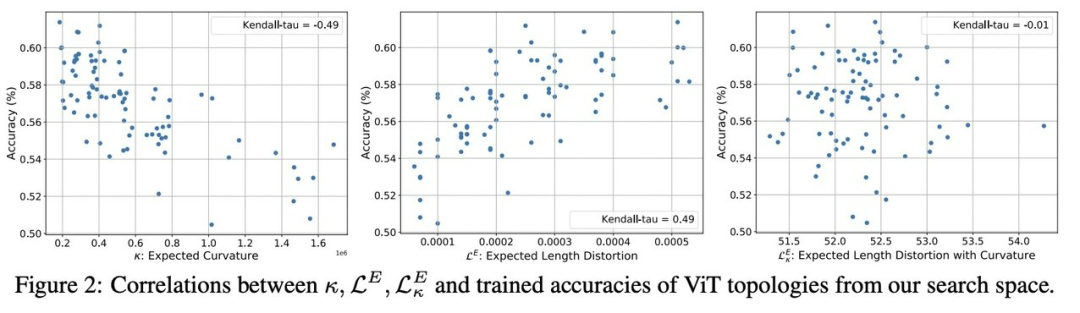 ViT 训练速度很慢,因此,通过评估训练模型的准确率来进行架构搜索的成本将高得让人难以承受。最近学界出现很多用基于 ReLU 的 CNN 的免训练神经架构搜索方法,利用局部线性图 (Mellor et al., 2020)、梯度敏感性 (Abdelfattah et al., 2021)、线性区域数量 (Chen et al., 2021e;f) 或网络拓扑(Bhardwaj et al., 2021)等方式。