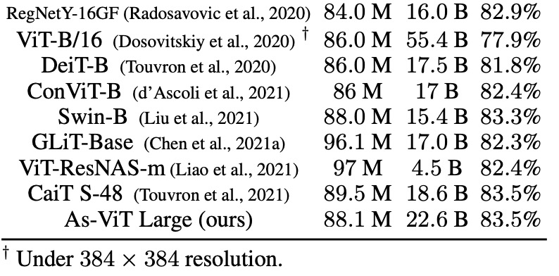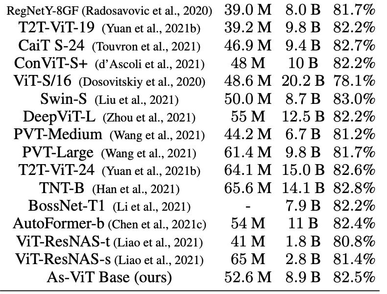 下表 5 展示了 As-ViT 与其他模型的比较。与之前基于 Transformer 和基于 CNN 的架构相比,As-ViT 以相当数量的参数和 FLOP 实现了 SOTA 性能。