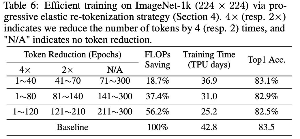 如图 4 所示,当 ViT 在早期训练阶段使用粗采样训练 ViT 时,它仍然可以获得很高的准确率,同时需要极低的计算成本。不同采样粒度之间的转换引入了性能的跳跃,最终网络恢复了具有竞争力的最终性能。