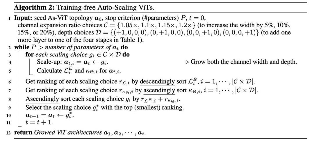 目前,对于 ViT 扩展没有这样的经验法则。最近的工作试图扩大或增长不同大小的卷积网络以满足各种资源限制(Liu et al., 2019a; Tan & Le, 2019)。然而,为了自动找到一个有原则的扩展规则,训练 ViT 将花费巨大的计算成本。也可以搜索不同的 ViT 变体(如第 3.3 节中所述),但这需要多次运行。相反,「向上扩展,scaling-up」是在一个实验中生成多个模型变体的更自然的方式。因此,该研究试图以一种免训练且有原则的有效方法将搜索到的基本「种子」ViT 扩展到更大的模型。算法 2 中描述了这种自动扩展方法: