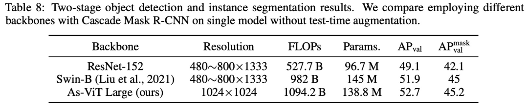该研究将 As-ViT 与标准 CNN 和之前的 Transformer 网络进行了比较。比较是通过仅更改主干而其他设置未更改来进行的。从下表 8 的结果可以看出,As-ViT 也可以捕获多尺度特征并实现最先进的检测性能,尽管它是在 ImageNet 上设计的,并且它的复杂性是为分类而测量的。