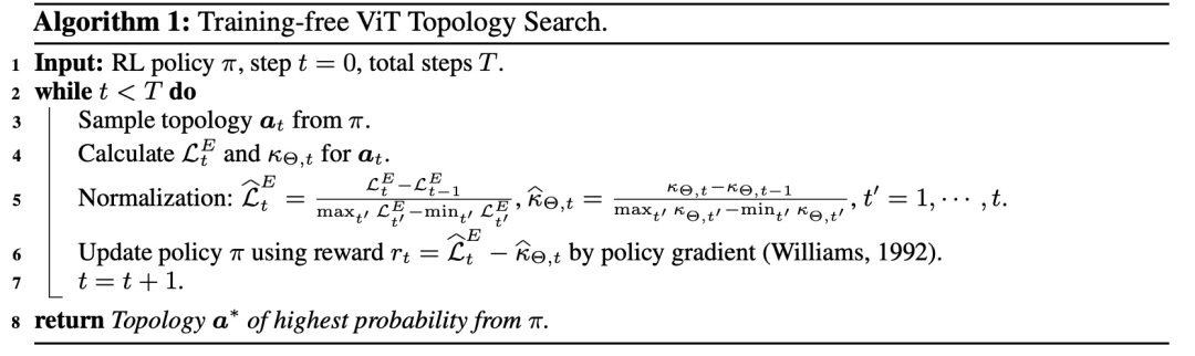 研究者提出了基于 L^E 的免训练搜索(算法 1),大多数 NAS(神经架构搜索)方法将单路径或超级网络的准确率或损失值评估为代理推理。当应用于 ViT 时,这种基于训练的搜索将需要更多的计算成本。对于采样的每个架构,这里不是训练 ViT,而是计算 L^E 并将其视为指导搜索过程的奖励。