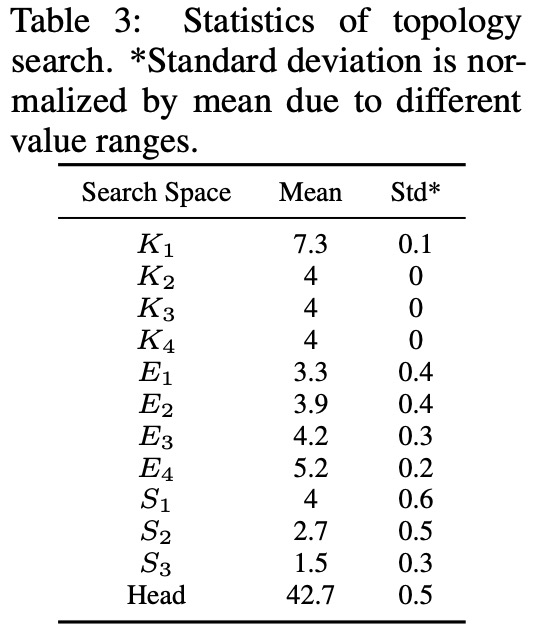 表 3 总结了新搜索方法的 ViT 拓扑统计数据。我们可以看到 L^E 和 κΘ 高度偏好:(1)具有重叠的 token (K_1∼K_4 都大于 stride ),以及(2)在更深层中更大的 FFN 扩展率(E_1 < E_2 < E_3 < E_4)。在注意力分裂和正面数量上没有发现 L^E 和 κΘ 的明显偏好。