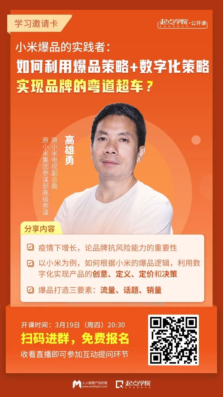 本周四(3月19日)20:30,起点学院公开课特别邀请了原小米电视副总裁、原小米集团参谋部高级参谋@高雄勇老师,他将结合小米打造爆款产品的经历,与你聊聊如何利用爆品策略+数字化策略,实现品牌的弯道超车!