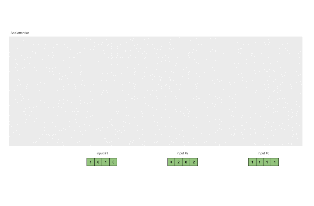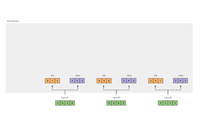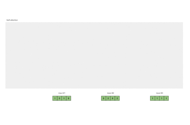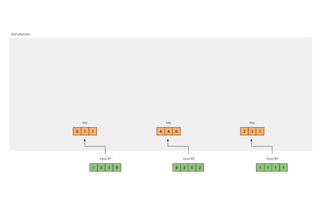 为了得到这些表示,每个输入(绿色)都乘以一组键的权重、一组查询的权重,以及一组值的权重。在本示例中,我们将三组权重“初始化”如下。