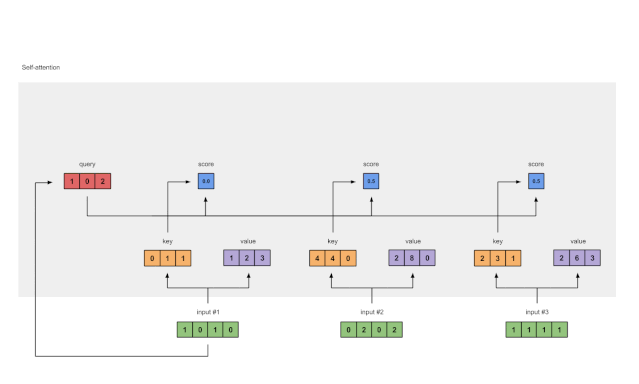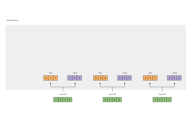 keys = x @ w_keyquerys = x @ w_queryvalues = x @ w_valueprint(keys)# tensor([[0., 1., 1.],# [4., 4., 0.],# [2., 3., 1.]])print(querys)# tensor([[1., 0., 2.],# [2., 2., 2.],# [2., 1., 3.]])print(values)# tensor([[1., 2., 3.],# [2., 8., 0.],# [2., 6., 3.]])