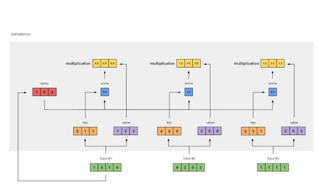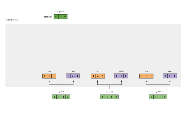 结果向量[2.0,7.0,1.5](深绿色)是输出1,该输出基于输入1与所有其他键(包括它自己)进行交互的查询表示。