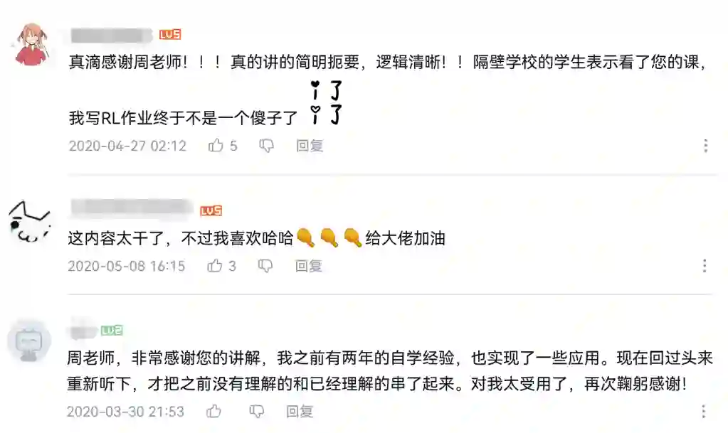 B站上周博磊老师的“强化学习纲要”课程下的网友好评