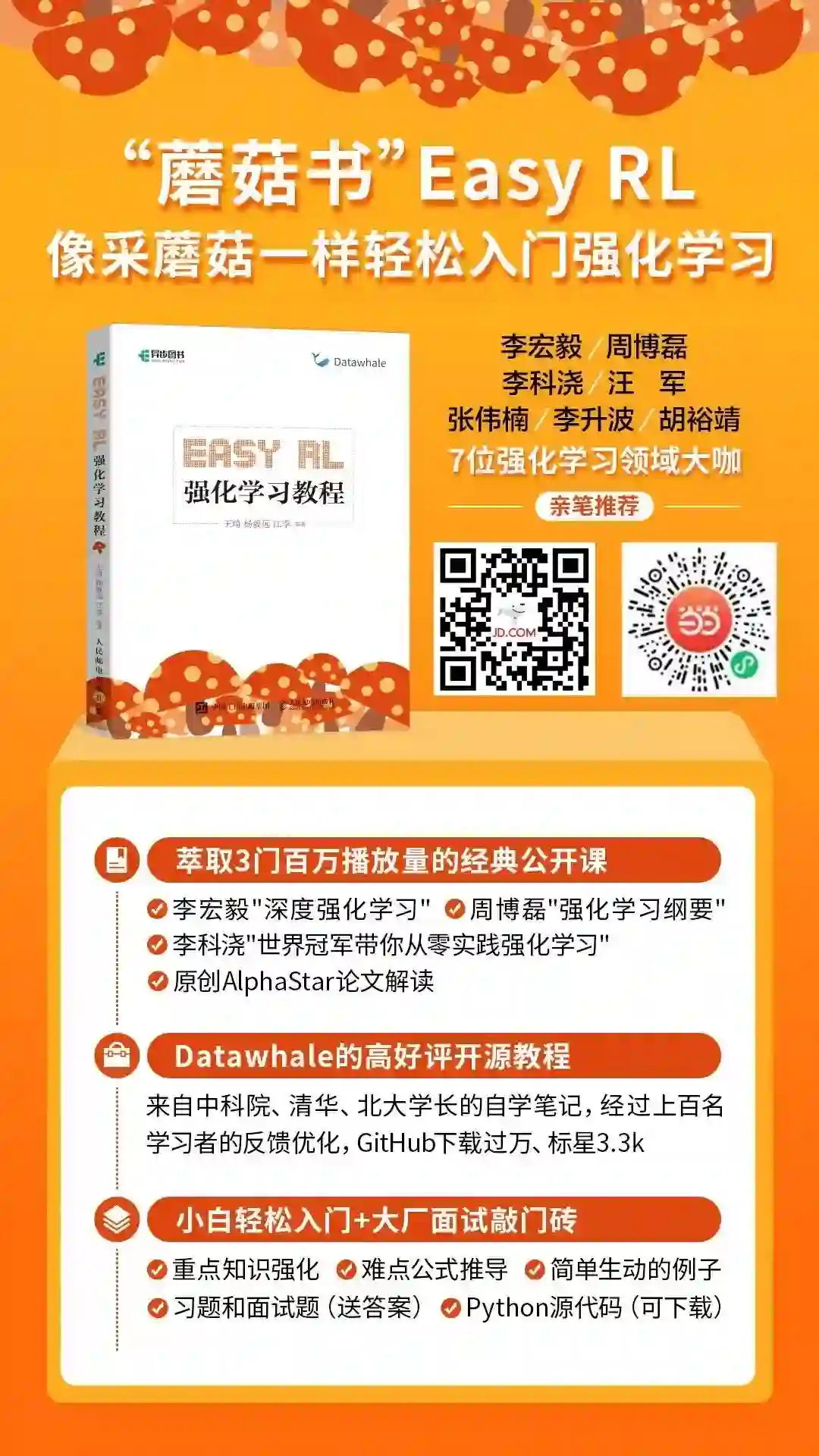 强化学习之路道阻且长,就让这本从学习者角度出发、受到众多专家联合力荐的强化学习落地指南《Easy RL:强化学习教程》带大家像采蘑菇一样轻松学会强化学习吧!