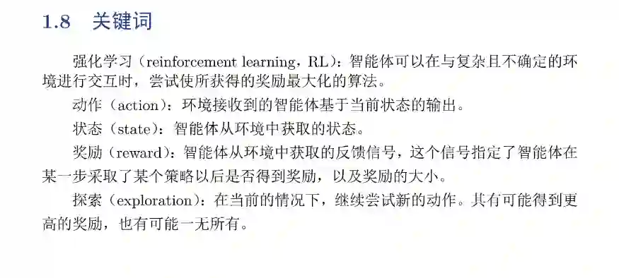 内容虽多,但是作者们非常贴心地整理了强化学习中的大量关键词,总结了对应章节的重点概念,以方便读者高效地回忆并掌握核心内容。