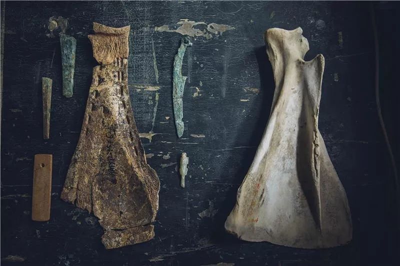 考古学家2009年第一次识别出从事甲骨占卜的贞人的墓葬,相关文物仍在清理之中,图片展示了占卜和刻字过程中使用的钻、凿等,图中两块牛骨分别是三千多年前使用过的卜骨(左)和现代的牛肩胛骨(右)(蔡小川 摄)