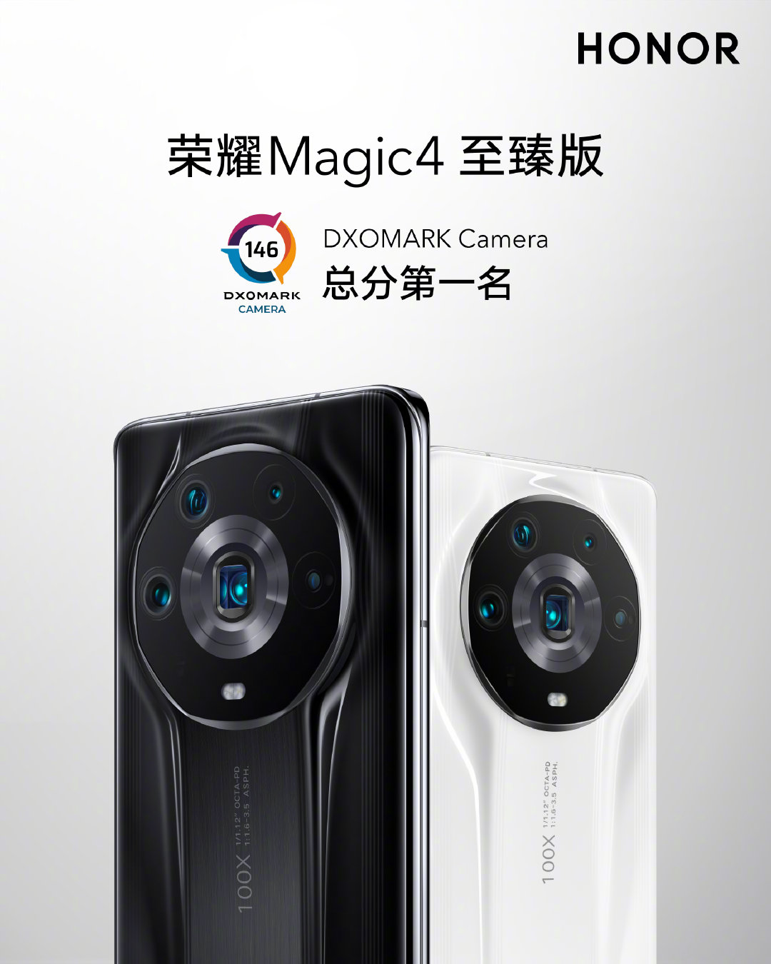 荣耀 Magic4 至臻版标志性缪斯之眼设计,潜望长焦镜头如同一颗明眸居于正中,镜头模组对称环绕,配备纳米微晶陶瓷背板 +5 倍抗摔超曲纳米微晶面板。该版本搭载骁龙 8 Gen 1 处理器,后置 5000 万像素广角摄像头 +6400 万像素潜望式长焦摄像头 +6400 万像素超广角摄像头 +5000 万光谱增强摄像头,采用全球首款支持双自由曲面 6400 万超广角摄像头,边缘畸变低至0.5%。该机还搭载全新荣耀专业电影格式 Magic-Log2,DXO 影像总分第一名。
