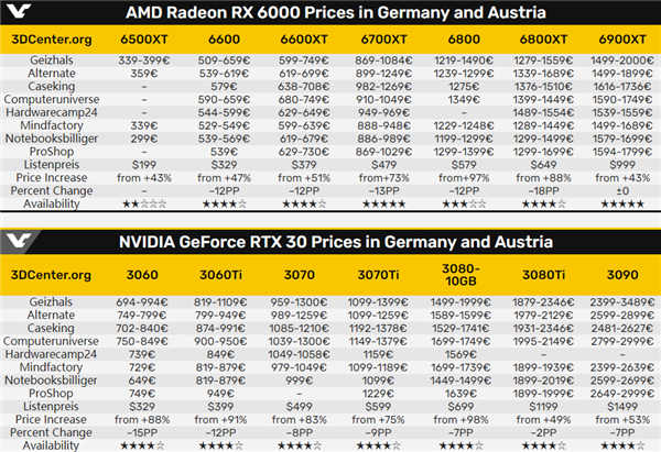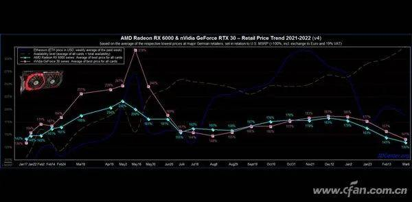 德国市场的统计显示,截至 3 月中上旬,英伟达 RTX 30系列、AMD RX 6000系列的平均溢价幅度已经分别持续降至 41%、35%,库存情况也稳定改善。而美国 eBay 上的数据显示,最近一个月来,显卡整体平均价格下降了 8.8%,最多的甚至降低了超过 20%,而相比去年 12 月份整体已经下降 25%。