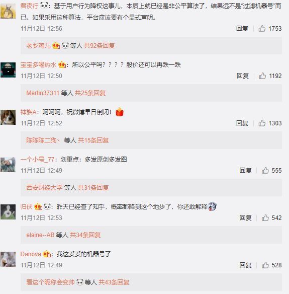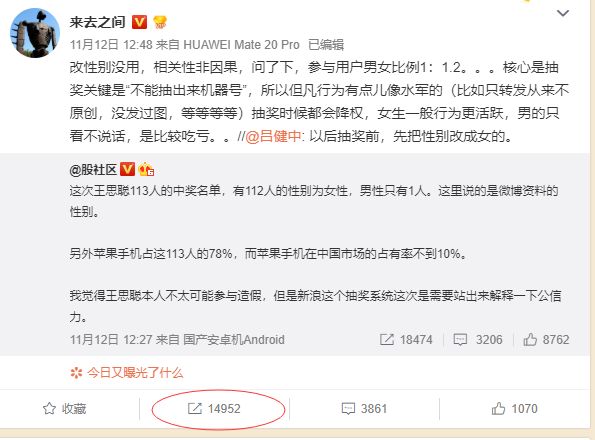 在苹果降频门之后,恐怕没几个人还乐意给这种明晃晃的商业行为洗地:不公平就是不公平,即便不公平的理由再冠冕堂皇,暗箱操作也是暗箱操作,不告知也是不告知。微博避开疑似bot、避开不活跃用户、有显著的性别歧视(至少在结果上),有没有在每次抽奖前告诉用户?没有。