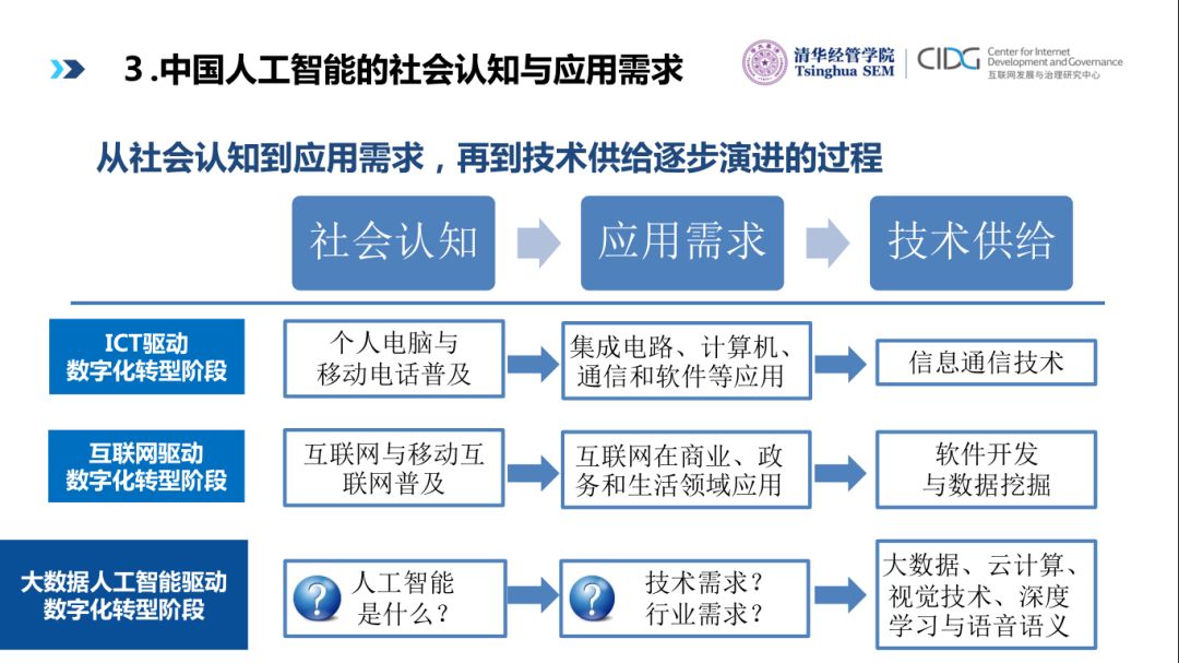数字化转型,从ICT驱动、互联网驱动到大数据人工智能驱动都经历社会认知、应用需求,技术供给这三个阶段。应用需求有两种,一种是技术应用需求,另一种是行业应用需求。技术应用需求从人工智能的核心技术如计算机视觉、语音语义识别、深度学习出发找应用场景,行业应用需求聚焦在智能驾驶、安防、金融、商务零售、医疗、制造业等人工智能当前最相关的行业。