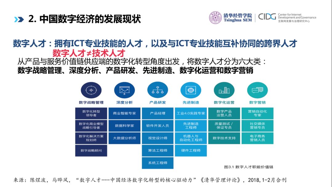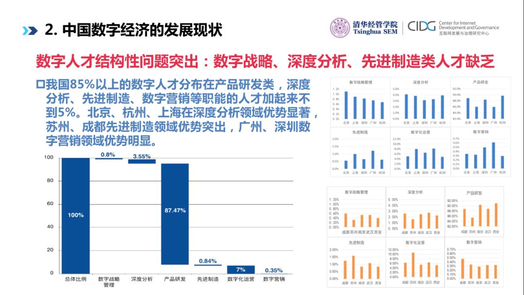 但是中国数字人才结构性问题非常突出:不均衡、不充分。我们将近90%的数字人才在产品研发、数字化的运营上,而深度分析不到4%,数字战略管理0.8%,先进制造0.84%,数字营销0.35%。