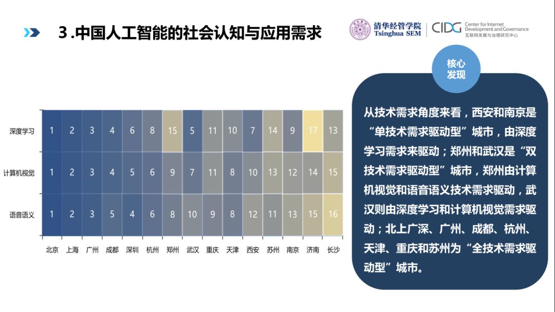 总的来说,在全国层面,无论从社会认知还是应用需求角度,中国从2017年3月开始正式进入人工智能驱动的经济数字化转型阶段。人工智能的社会认知从基本认知程度发展到深层次专业和技术认知;技术应用需求整体上一直呈上升趋势,行业应用需求在2017 年3月进入跃升期。在区域层面,无论是人工智能社会认知还是应用需求方面,南方城市在排名上都比北方城市具有优势,长三角地区尤为突出。同时,排名靠前的城市集中在北上广深和各省会城市。从技术应用需求角度看,不同城市可分为全技术需求驱动、双技术需求驱动和单技术需求驱动三类。从行业应用需求角度,不同城市可分为全行业需求驱动和部分行业需求驱动两类。