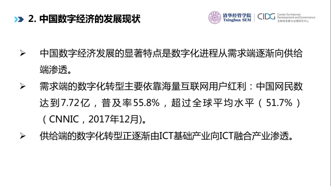 中国数字经济发展的显著特点是什么?我认为一个重要特点是从需求端或者消费端向供给端或者生产端转移。中国发展数字经济有一个巨大的优势和特点是我们拥有世界上最大的数字用户的红利。我们作为世界上最大的数据资源大国,拥有庞大的数据资源,但是这个资源是没有被充分挖掘和利用的资源。