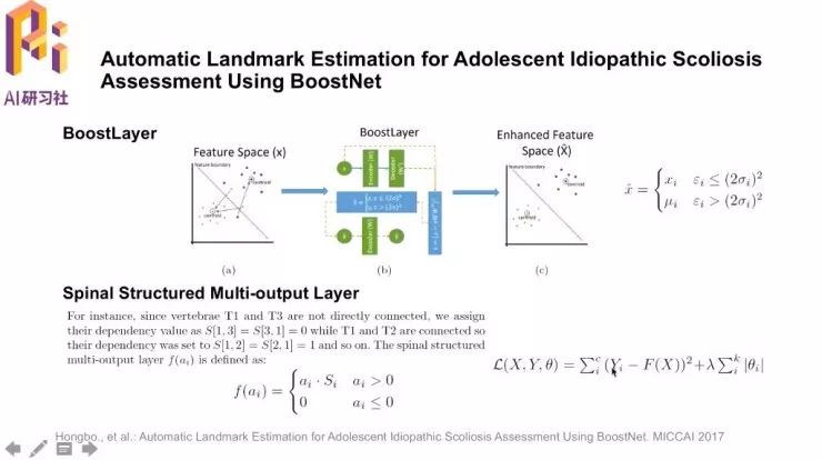 输入X光图像,经过卷积层后,BoostLayer的作用是去除大于两倍标准差σ的偏离值,再经过带有脊椎形状约束的Spinal Structured层之后,就可以输出关键点的定位结果。