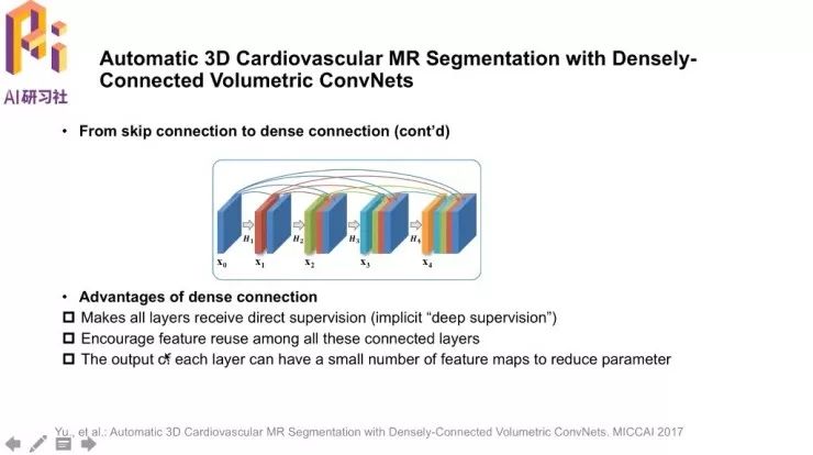 其中用到的DenseNet结构也是今年提出的新网络结构,比之前的ResNet有更密集的连接。这种网络结构的好处在于,1,每一层都能直接接收到指导信息,也就是隐式的“深度监督”;2,特征有很高的复用程度;3,能够降低feature map对应参数的数目这篇论文「Automatic 3D Cardiovascular MR Segmentation with Densely-Connected Volumetric ConvNets」也就来自陈浩博士团队,任务目标是全心脏的三维体积分割,采用了三维全卷积神经网络,并且把下采样的路径分成了不同的DenseBlock块,在不同的DenseBlock中增加池化层增大感受野。