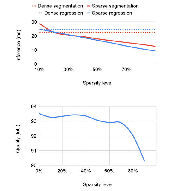 我们已经证实了,可以对分类任务、密集分割(例如,Meet 背景模糊)和回归问题 (MediaPipe Hands) 进行稀疏化,这会给用户带来实实在在的好处。例如,对于 Google Meet 而言,稀疏化将模型的推理时间缩短了 30%,从而令更多用户能够访问更高质量的模型。