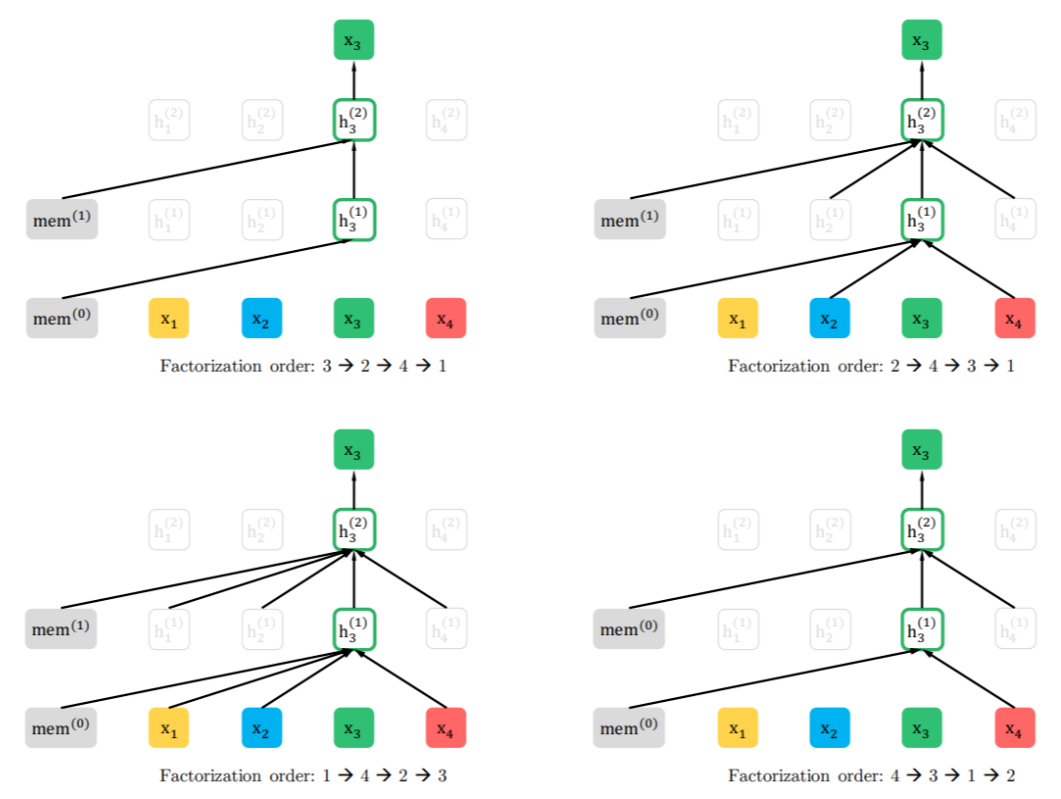 作者为了使得自回归模型能够利用上下文信息,且又不想像 BERT 那样引入 [mask] 噪声,提出了一种序列因式分解进行重新排列的策略。下面将通过一个原文附录中一个例子说明: