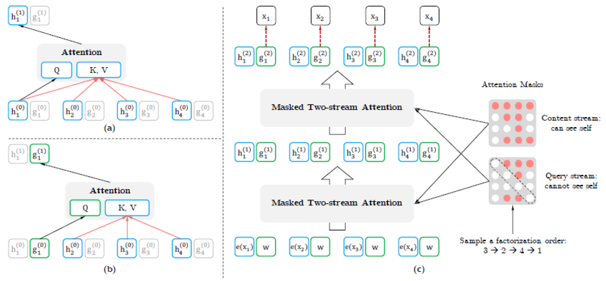 简单介绍完 Transofmer,转回本小节的主题 XLNet。关于 XLNet 可以介绍两点,即排列语言模型(也可以称为乱序语言模型,因为输入序列是随机排列)和双自注意力通道。