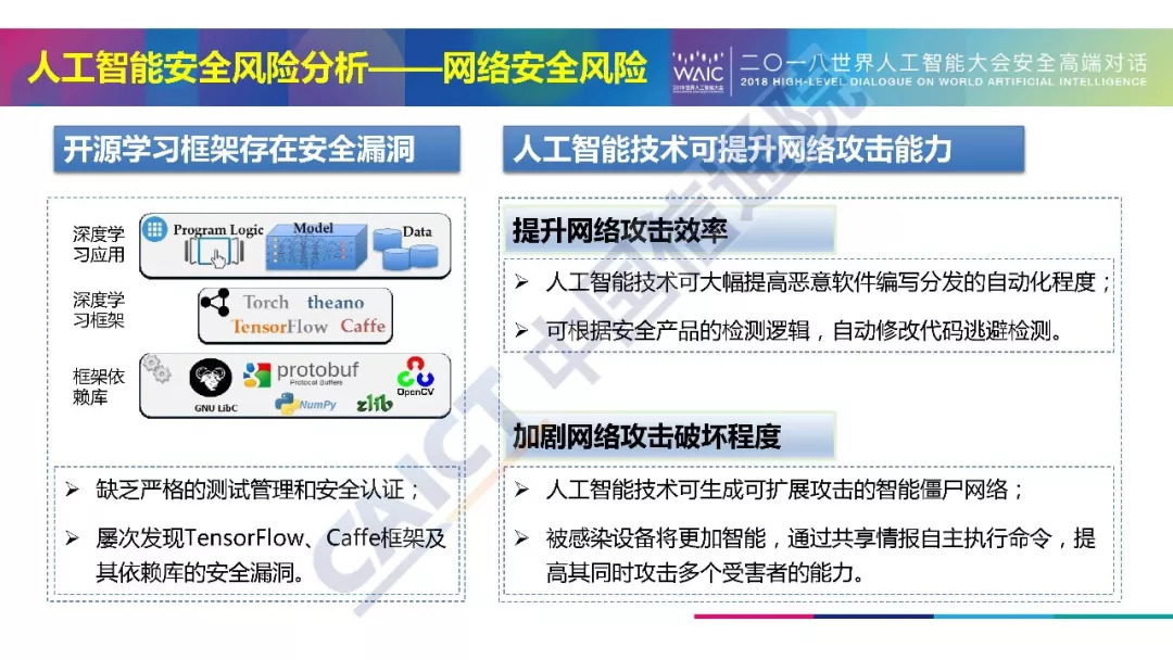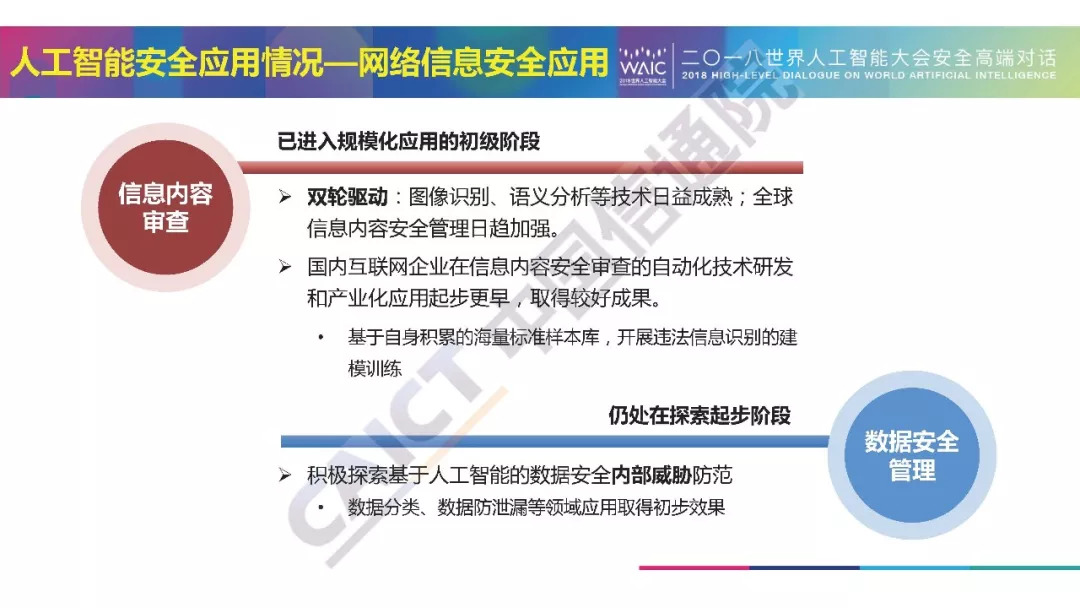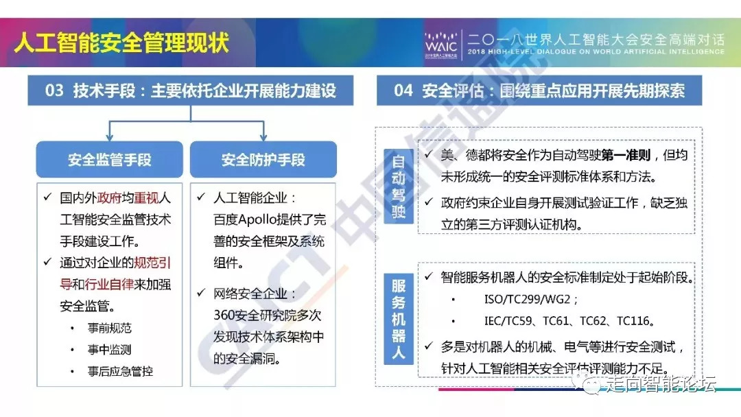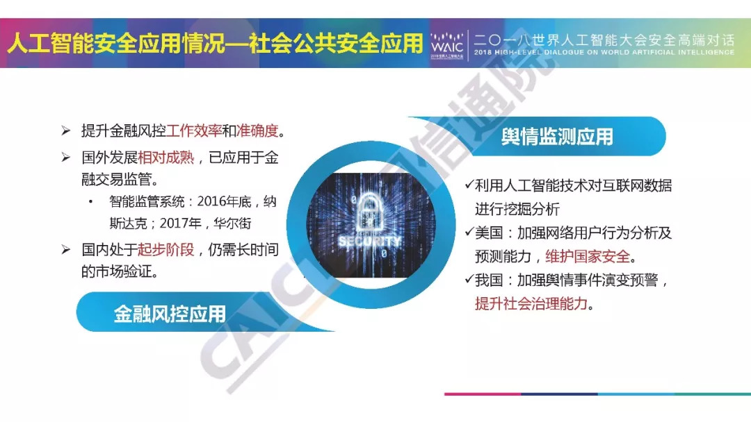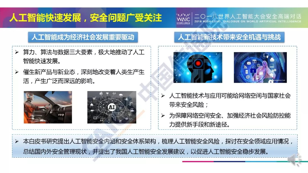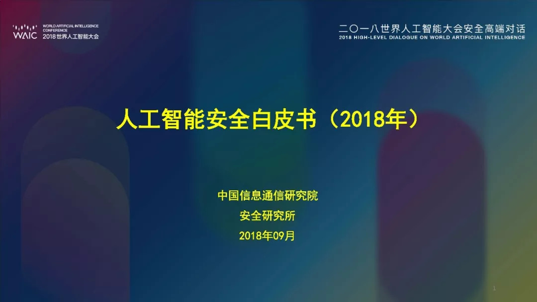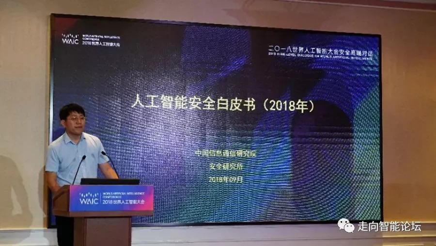 近日,在2018年世界人工智能大会“人工智能安全:挑战与机遇”高端对话中,中国信通院发布了《人工智能安全白皮书(2018年)》。中国信通院安全研究所信息安全研究部高级工程师牛金行对白皮书进行了解读。以下为解读PPT以及白皮书摘要,供大家学习交流。本文来自:中国信息通信研究院CAICT,经授权由《走向智能论坛》公号推荐阅读。