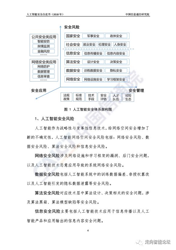 本白皮书从人工智能安全内涵出发,首次归纳提出了人工智能安全体系架构,在系统梳理人工智能安全风险和安全应用情况的基础上,进一步总结了国内外人工智能安全的管理现状,研究提出了我国人工智能安全风险应对与未来发展建议。