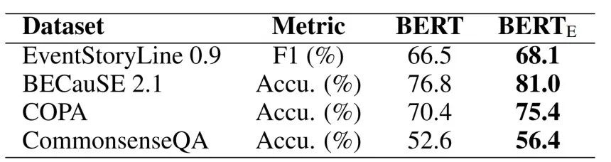 因果知识对于多种NLP任务具有重要意义。因此,e-CARE中包含的因果知识可能能够提升因果相关任务上的模型性能。为了验证这一点,我们首先在e-CARE上微调了e-CARE模型,并将微调后的模型(记作BERTE)分别 迁移至因果抽取数据集EventStoryLine[1]、两个因果推理数据集BECauSE 2.0[2]和COPA[3],和一个常识推理数据集CommonsenseQA[4]上,并观察模型性能。如下表所示,e-CARE微调后的模型在四个因果相关任务上均表现出了更好性能。这显示e-CARE能够提供因果知识以支撑相关任务上的性能。