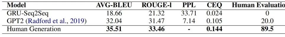 为测试模型在给定因果事实后生成合理的解释的能力,我们利用经典的GRU-Seq2Seq模型以及GPT2进行了解释生成实验。其中,我们使用自动评价指标AVG-BLEU、ROUGH-l、PPL,以及人工评价衡量生成质量。由表2可得,虽然相比于GRU-Seq-Seq,GPT2性能有明显提高,但是和人类生成的解释质量相比仍存在巨大差距,尤其在人工评价指标上。这显示,深度理解因果事实,并为此生成合理解释仍是相当具有挑战性的任务。而无法深度理解因果事实也可能是阻碍当前的因果推理模型性能进一步提高的主要因素之一。另一方面,这也一定程度显示所提出的解释生成质量评价指标CEQ的合理性。