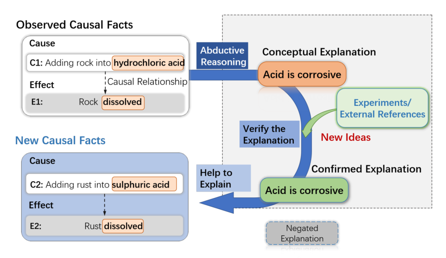造成这种差距的原因之一在于,当下的因果推理模型往往仅能够从数据中捕获到经验性的因果模式,但是人类则能够进一步追求于对于因果关系的相对抽象的深入理解。如图1中例子所示,当观察到原因事件 : 将石头加入盐酸造成结果 :石头溶解 之后,人类往往不会停留在经验性地观察现象这一层面,而会进一步深入思考,为什么这一现象能够存在?通过种种手段,最终得到一个概念性的解释,即酸具有腐蚀性。值得注意的是,这一对于因果现象的概念性解释是超越具体的现象本身,能够解释一系列相关现象的。借助此类解释信息,模型将可能产生对于因果命题的更加深入的理解。