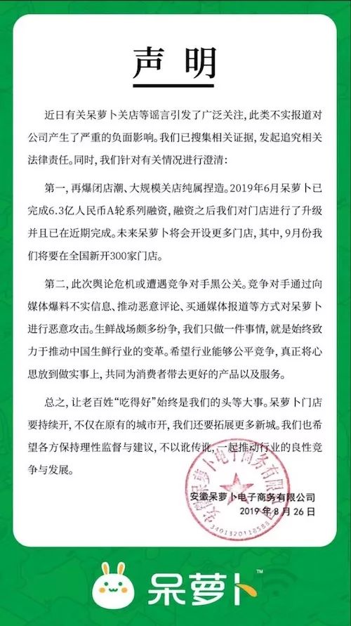早在今年8月份,呆萝卜就被曝出大规模关店。随后呆萝卜发声明称“不实报道,将追究相关法律责任”。声明中还表示,9月份将在全国新开300家门店。